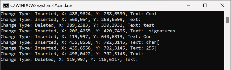 print(f"Type: {change.type}, X: {change.box.x}, Y: {change.box.y}, Text: {change.text}")