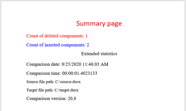 GroupDocs.Comparison for Python via .NET can generate a summary page with additional statistics about the comparison.