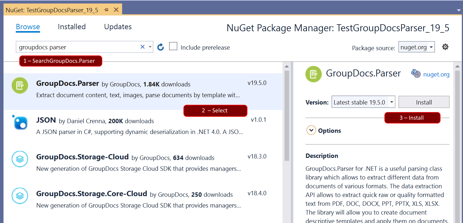 • Select Browse tab and type “GroupDocs.Parser” in the search text box.