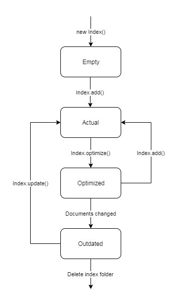 The life cycle of an index begins at the moment of creating an instance of the Index class and first saving the index files to disk. The index life cycle ends when a folder containing index files is deleted. Below is a diagram of the recommended sequence of index life cycle states.