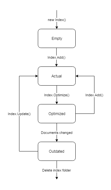 The life cycle of an index begins at the moment of creating an instance of the Index class and first saving the index files to disk. The index life cycle ends when a folder containing index files is deleted. Below is a diagram of the recommended sequence of index life cycle states.