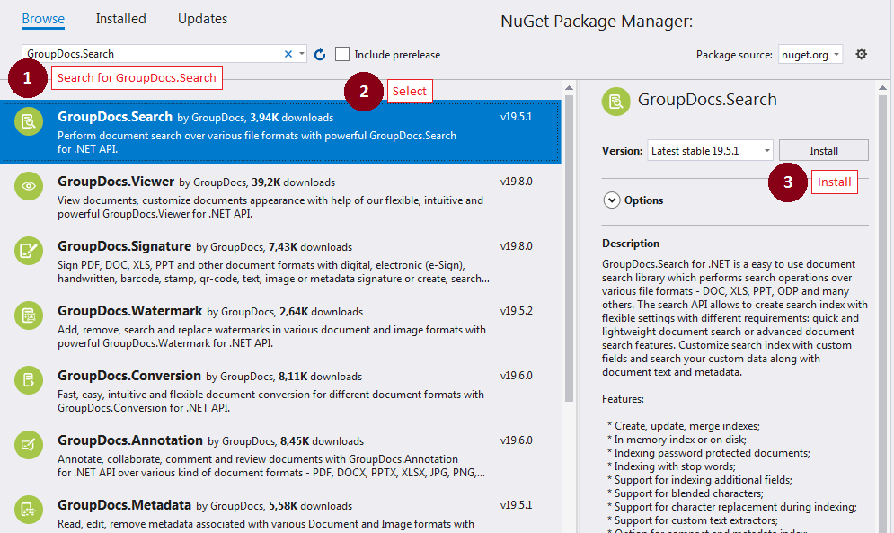 NuGet is the easiest way to download and install GroupDocs.Search for .NET. There are ways to install it in your project.